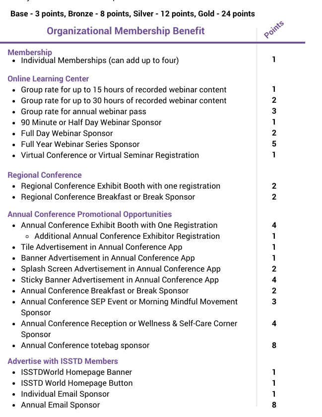 The following section indicates point values for different benefits. Each organizational membership level includes a set amount of points. It is up to the organization to decide which benefits they would like to use their points towards.